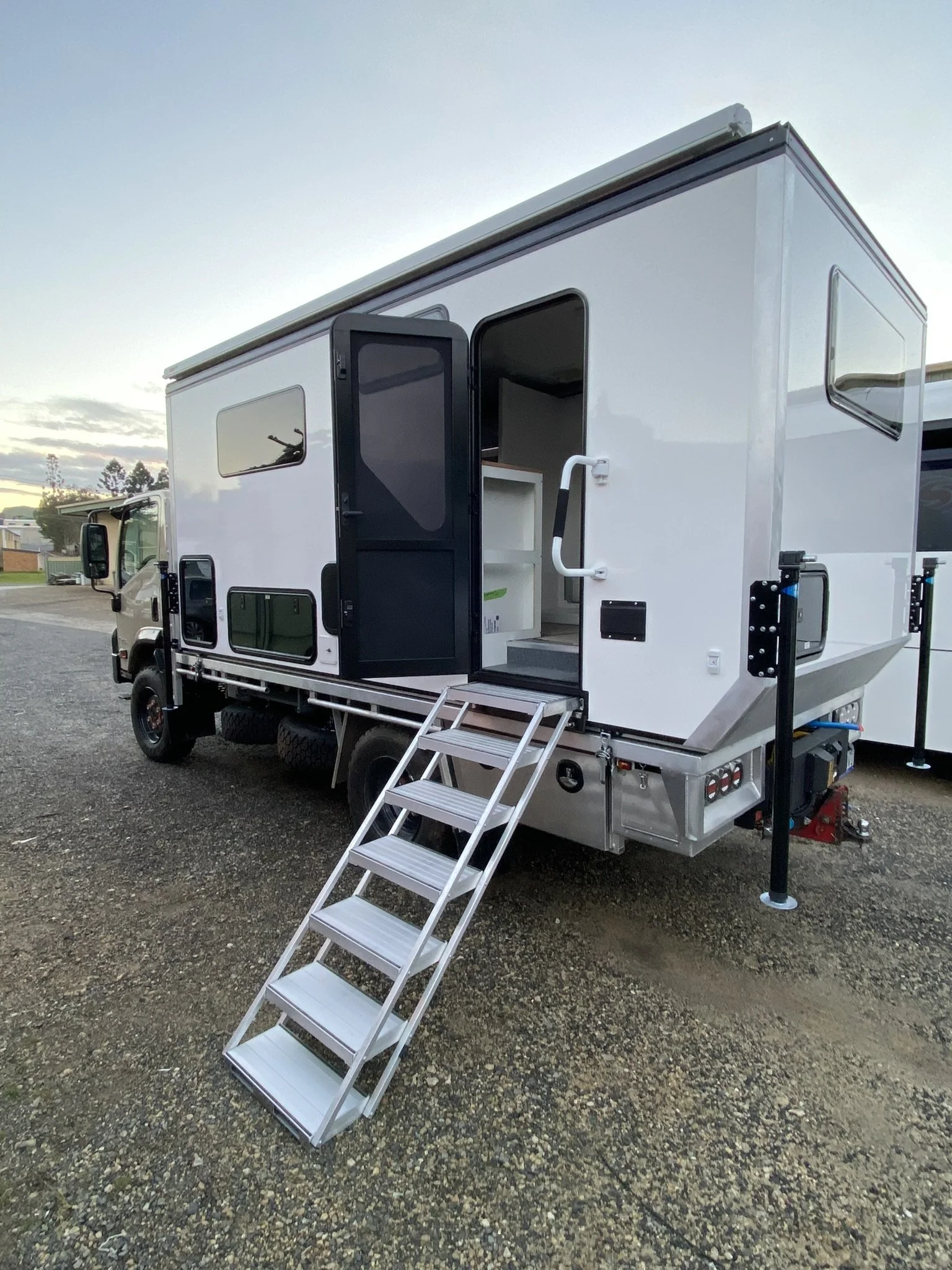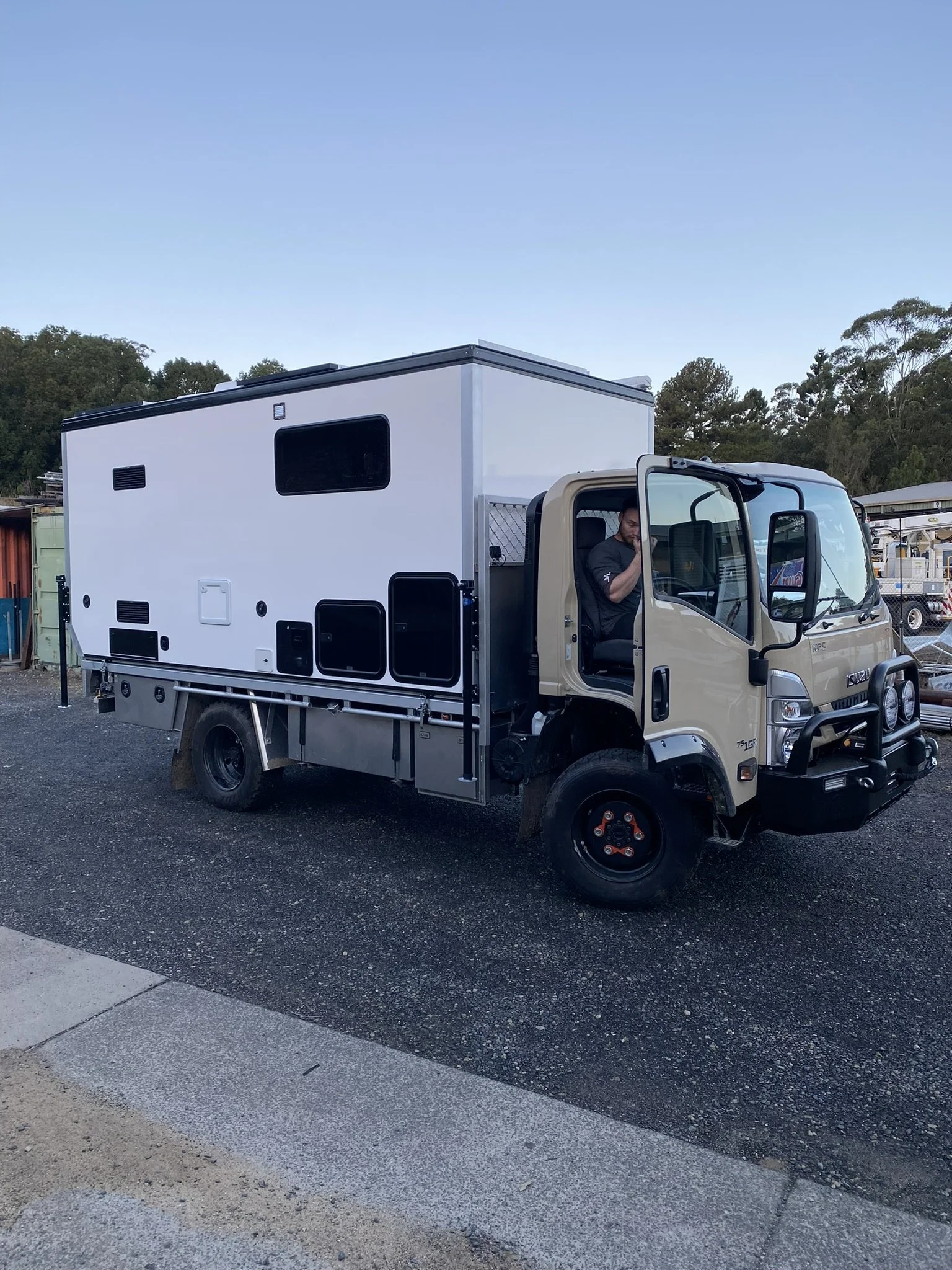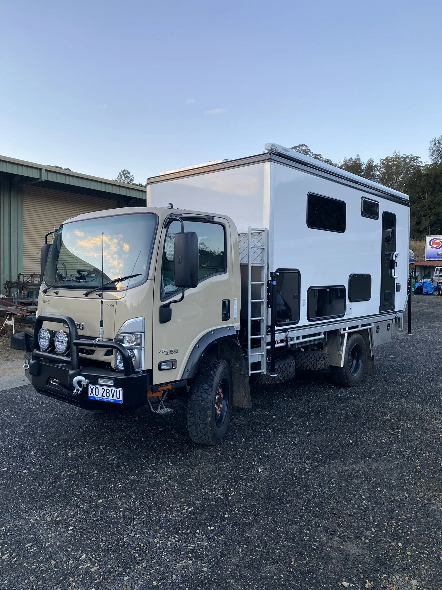 A beige off-road truck with a large white camper attached, parked on a gravel lot under a clear sky.