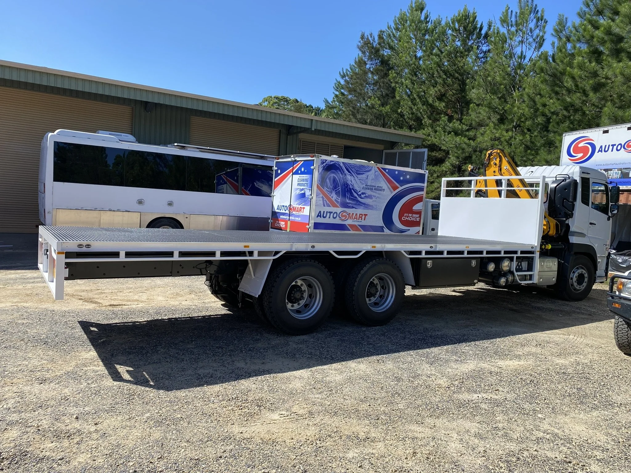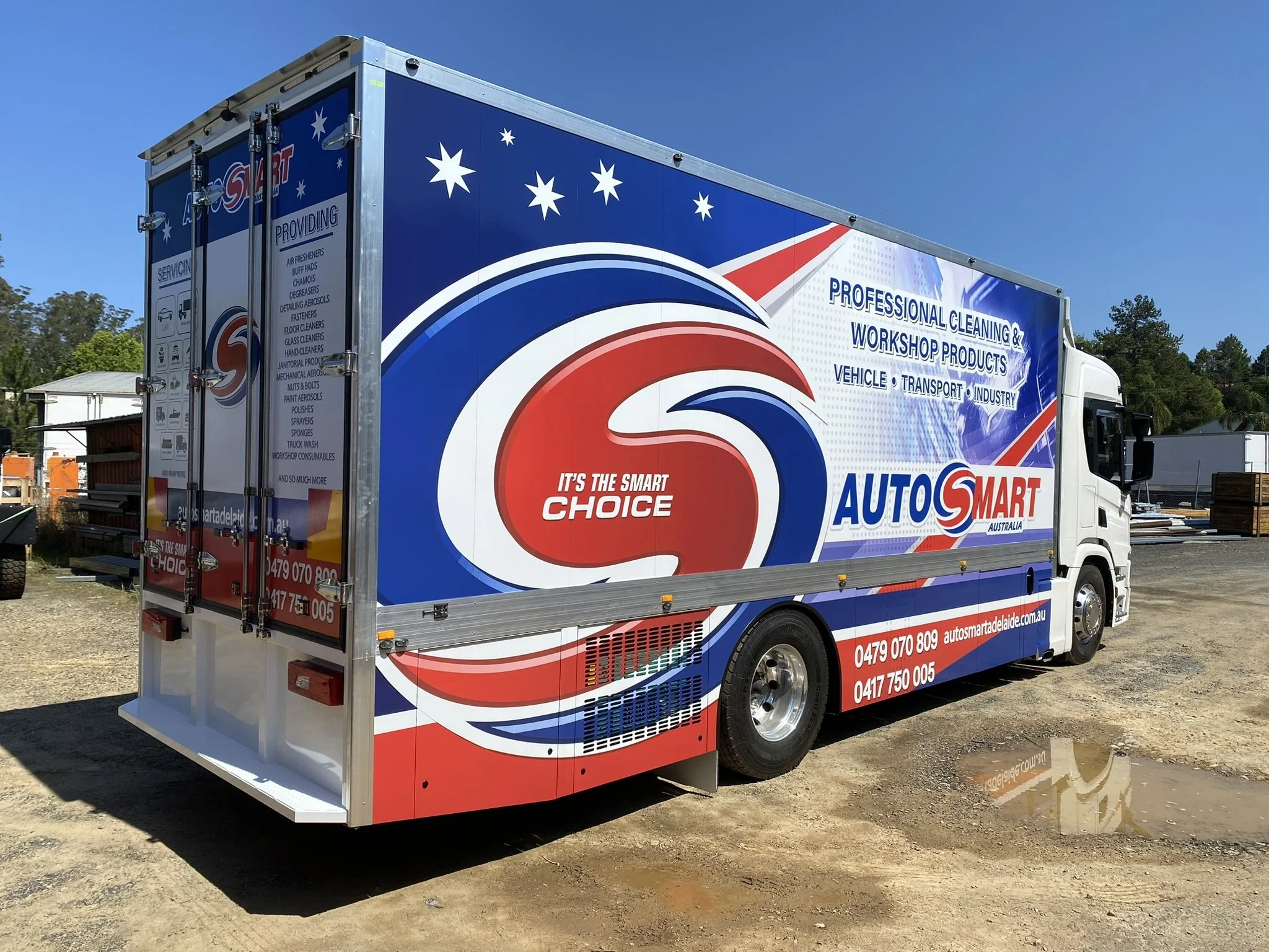 A large truck with blue, red, and white graphics advertising AutoSmart Australia, a professional cleaning and workshop products company, parked on a dirt surface with a clear blue sky.