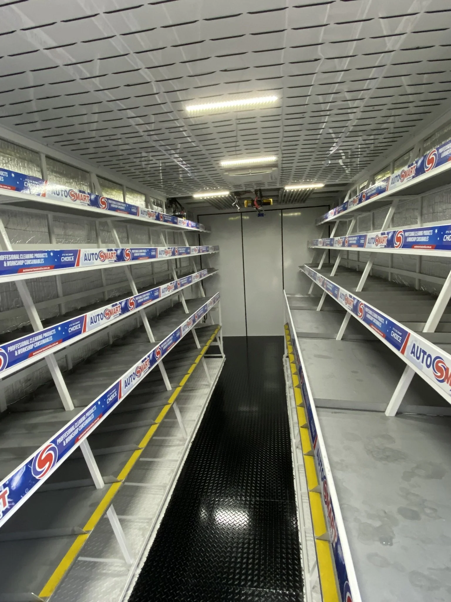 Empty shelving units in an AutoSmart store aisle with a black grated flooring down the middle and overhead lights.
