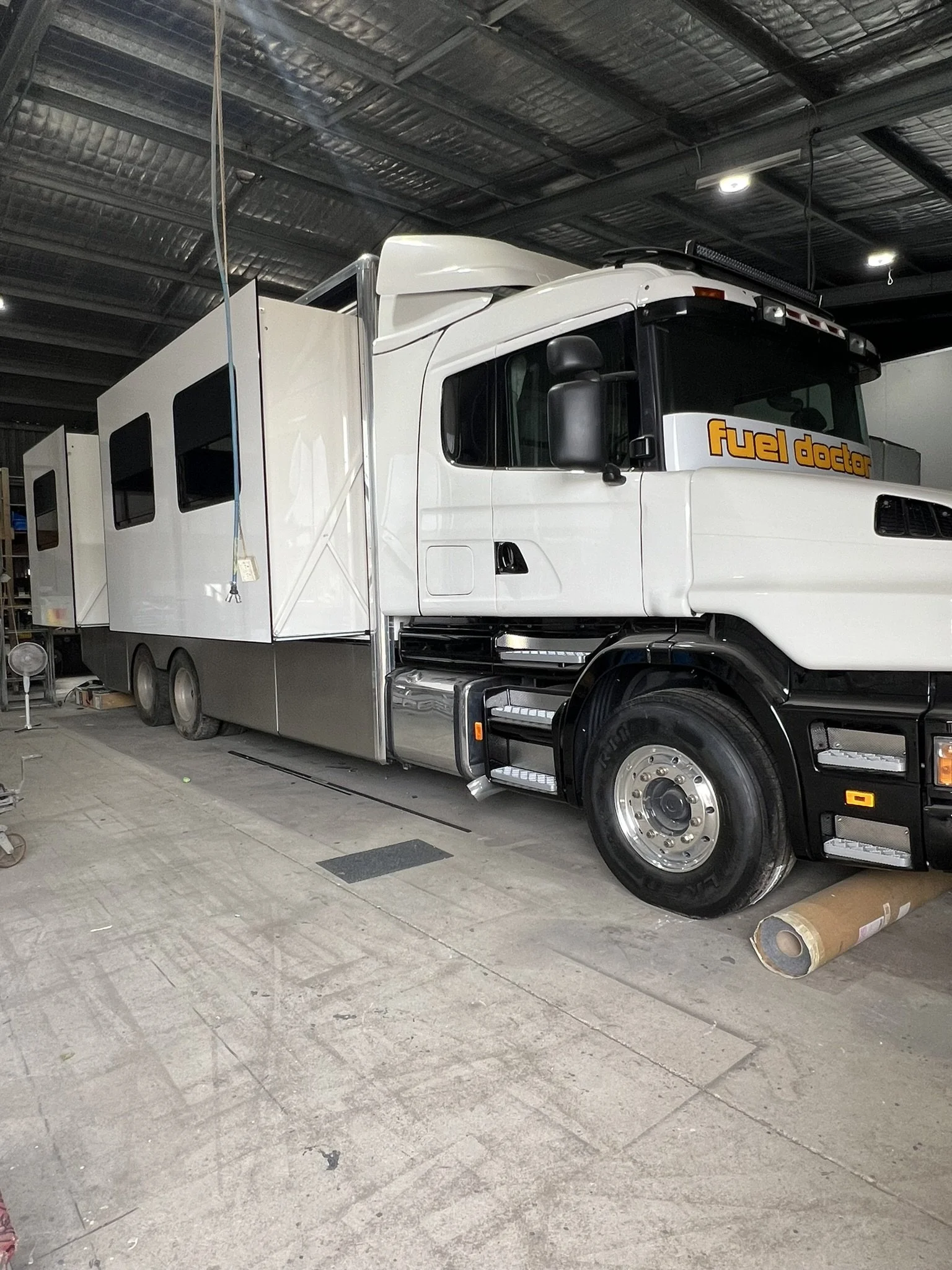 A large white truck with a modified cab and a mobile fuel station attached, labeled "fuel doctor," parked inside a warehouse.