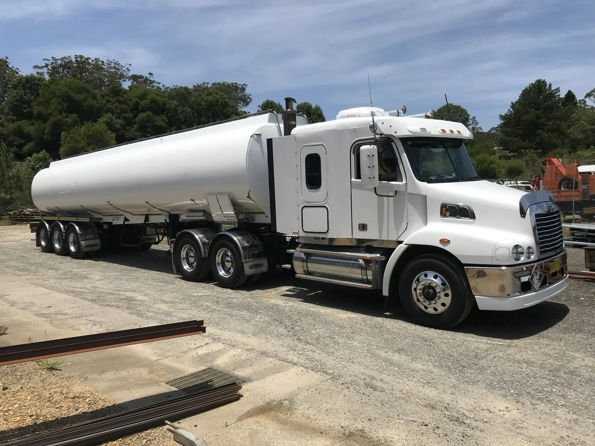 A white tanker truck parked outdoors on a gravel surface with trees and equipment in the background.