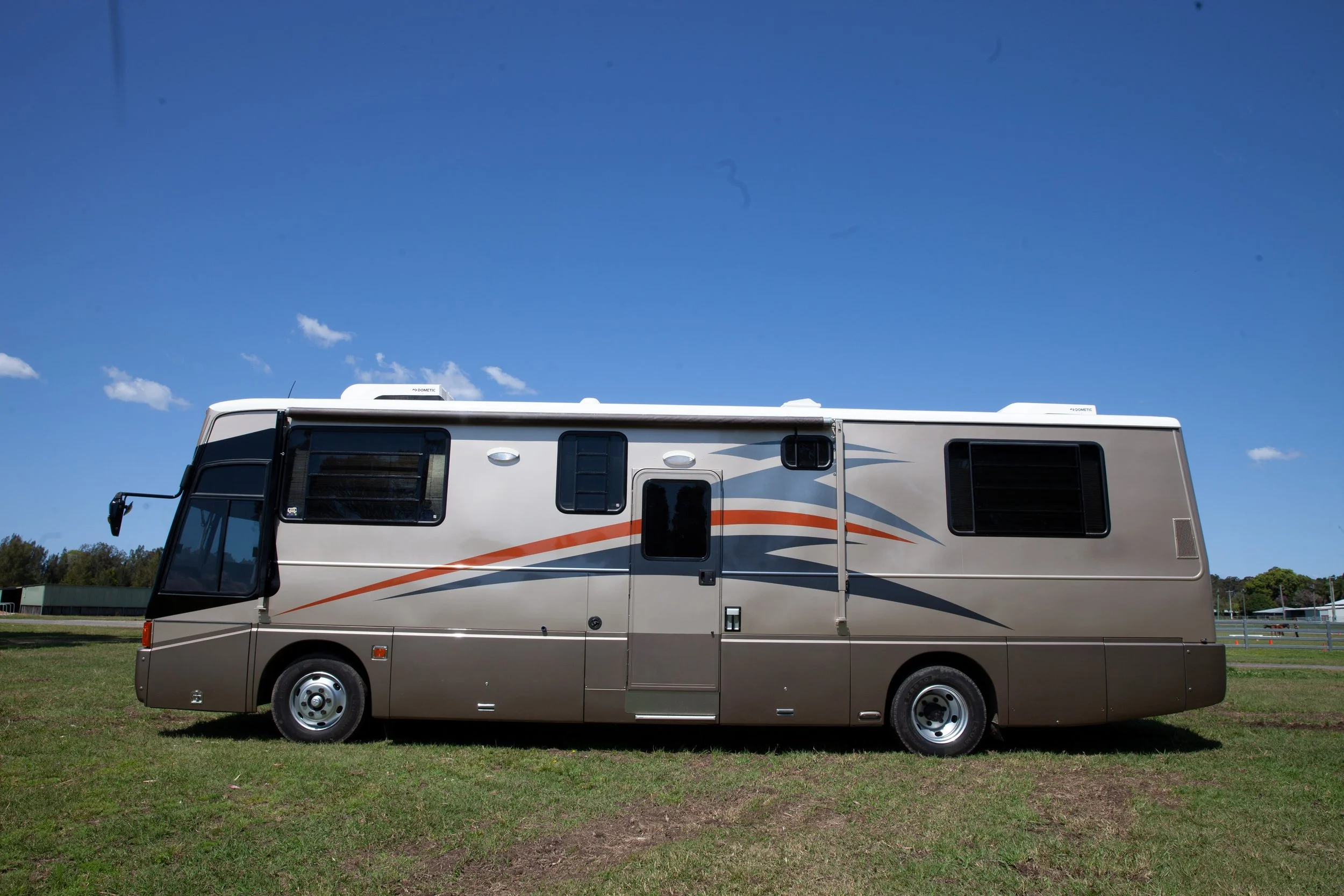 A beige motorhome with orange and gray graphics parked on grass under a clear blue sky.