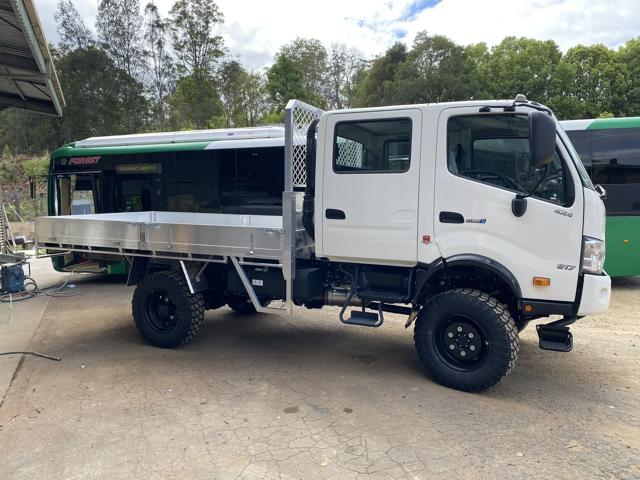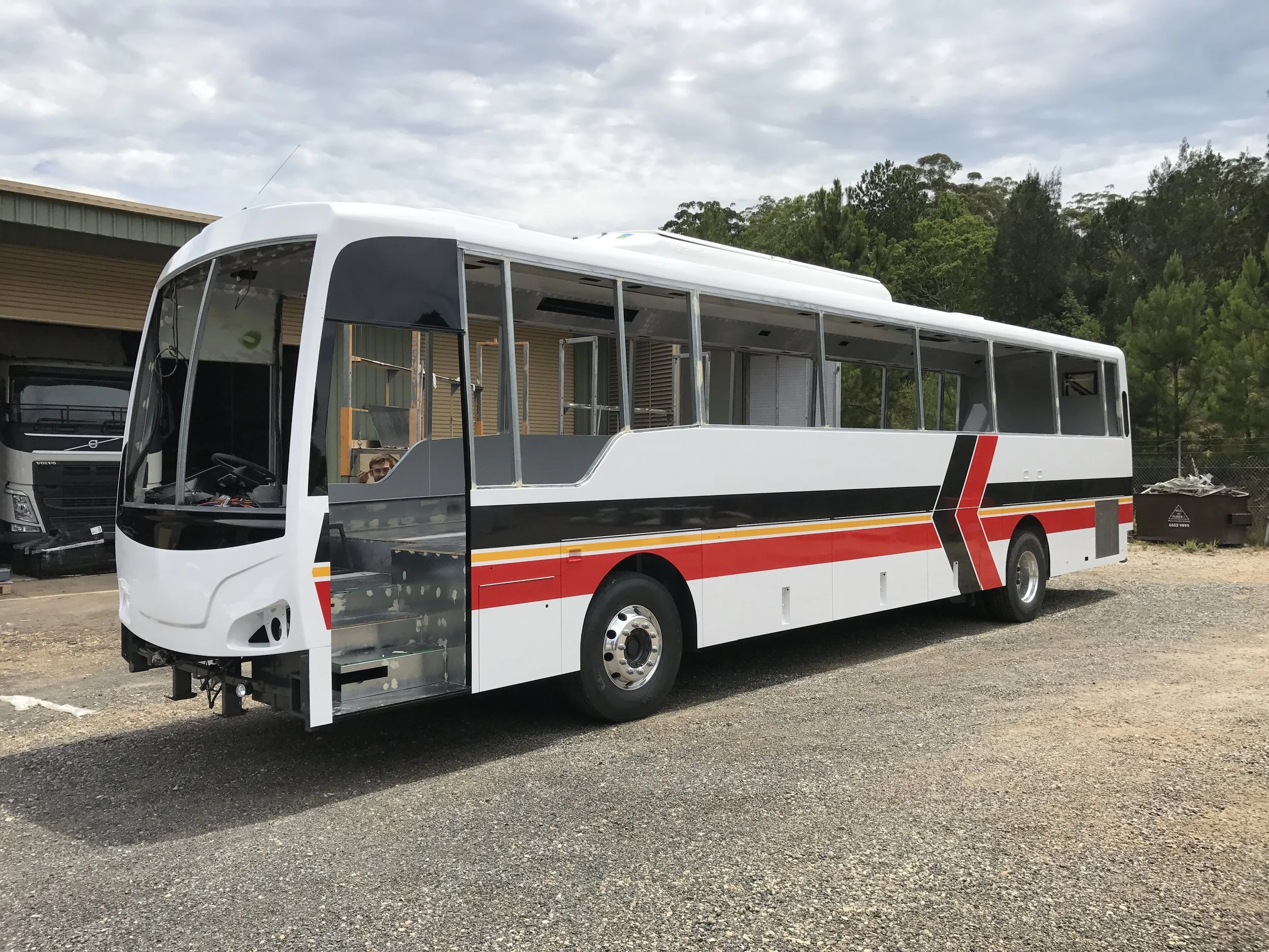 A partially assembled bus with a white and black exterior parked outdoors on a dirt surface, with trees and a building in the background.