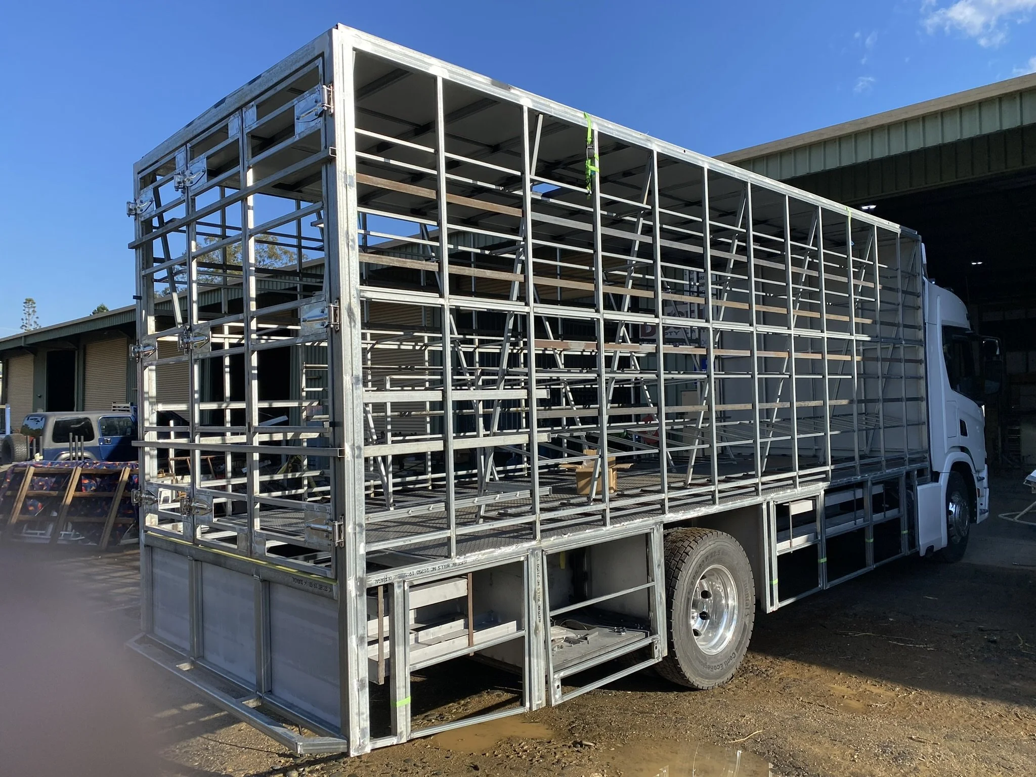 Large white truck with a metal framework structure on its back, parked outside under a blue sky.