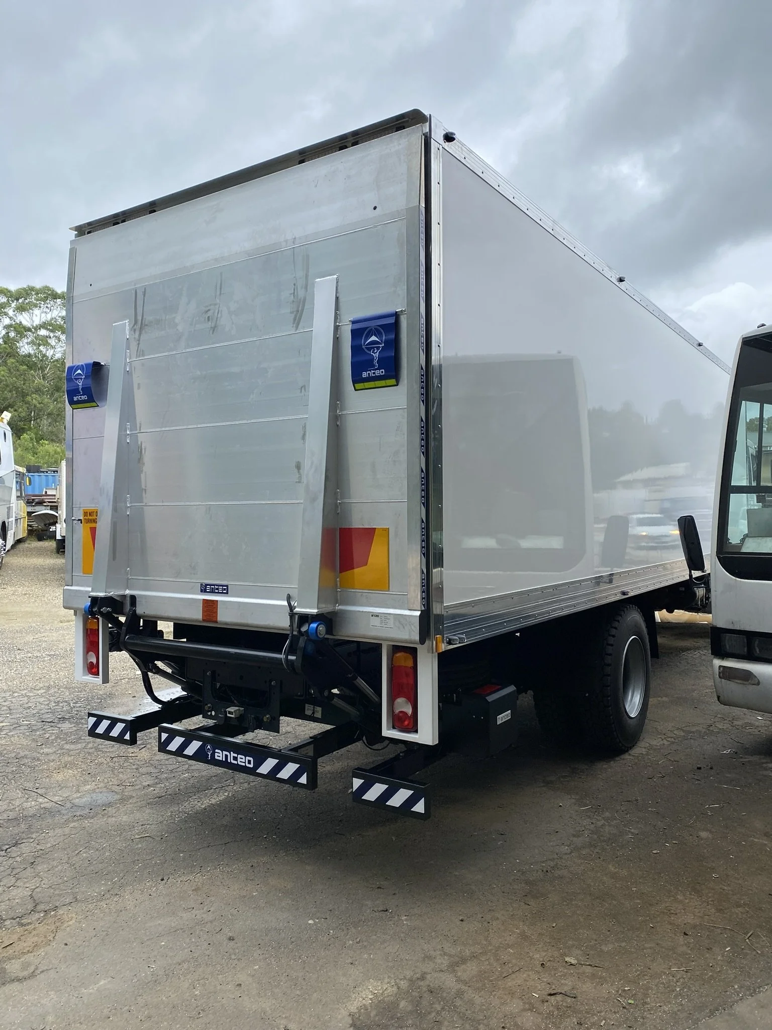 Rear view of a white refrigerated delivery truck with an automatic liftgate, parked outdoors on a cloudy day.
