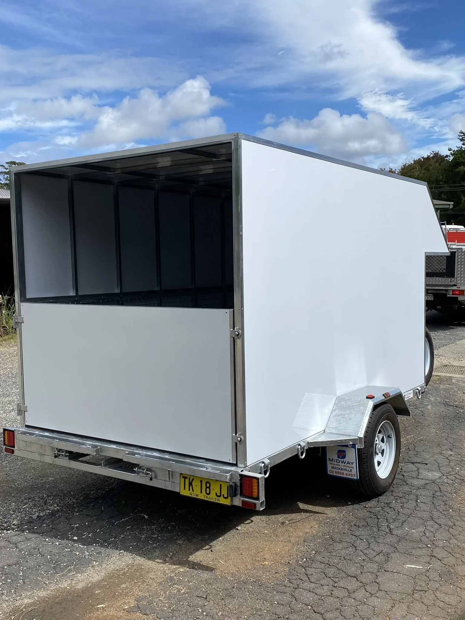 Empty white food truck trailer parked on gravel road under blue sky with white clouds.