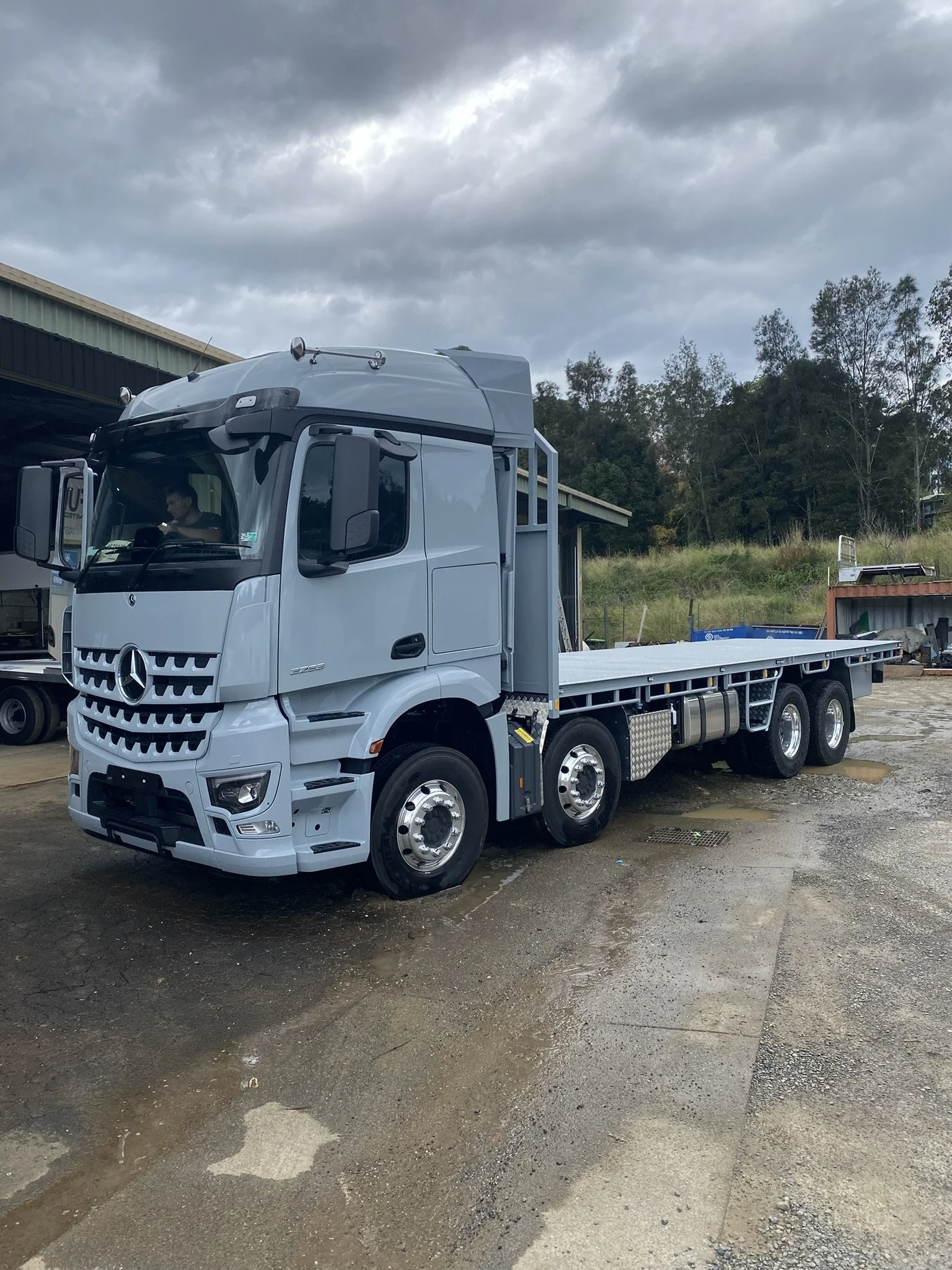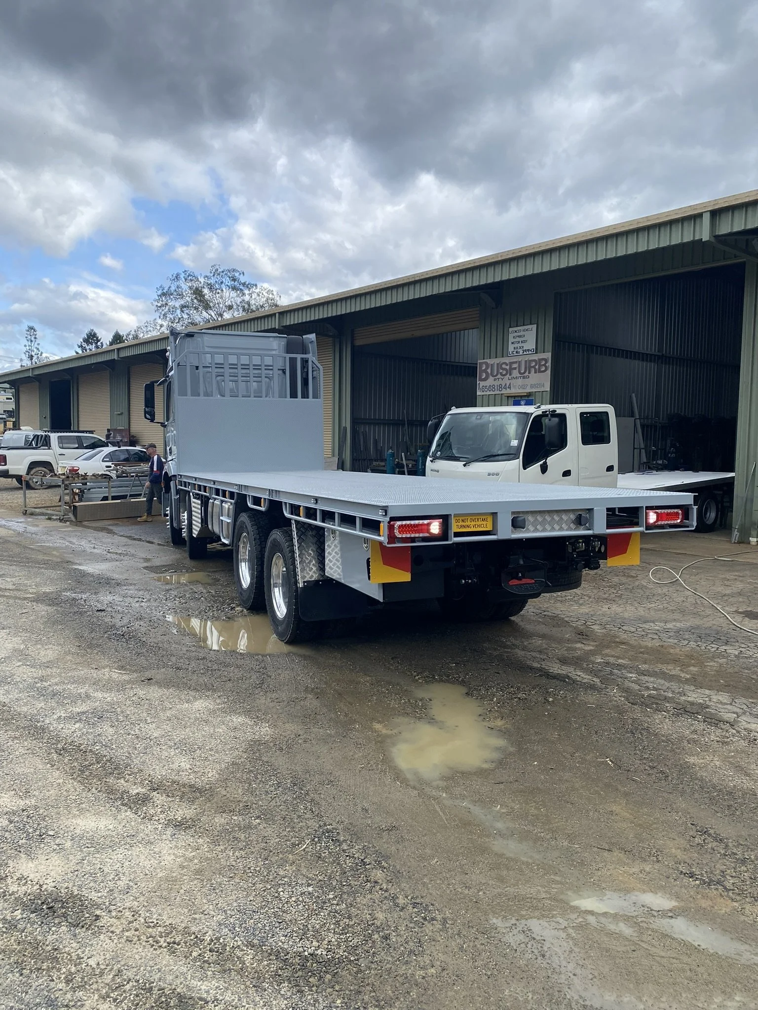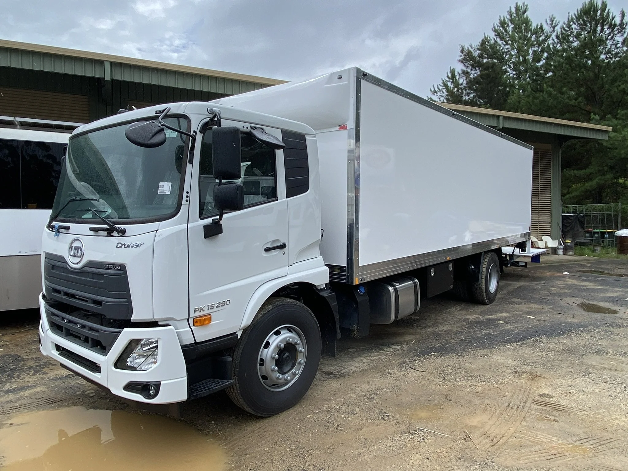 A white flatbed truck parked outside a building under cloudy sky, with puddles on the ground.