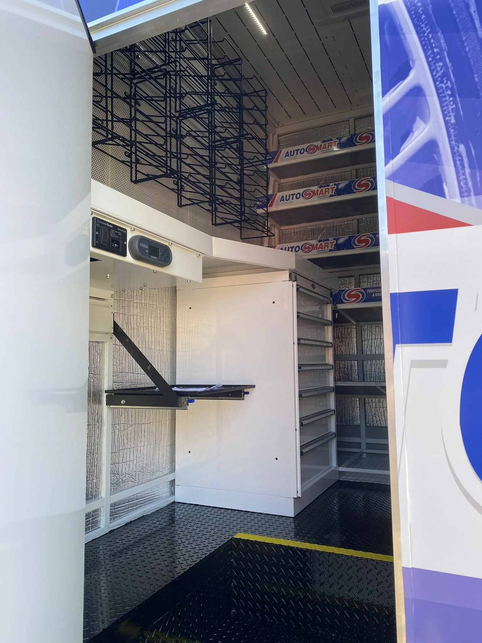 Interior of a mobile workshop or service vehicle, featuring shelves, wire racks, and storage compartments.