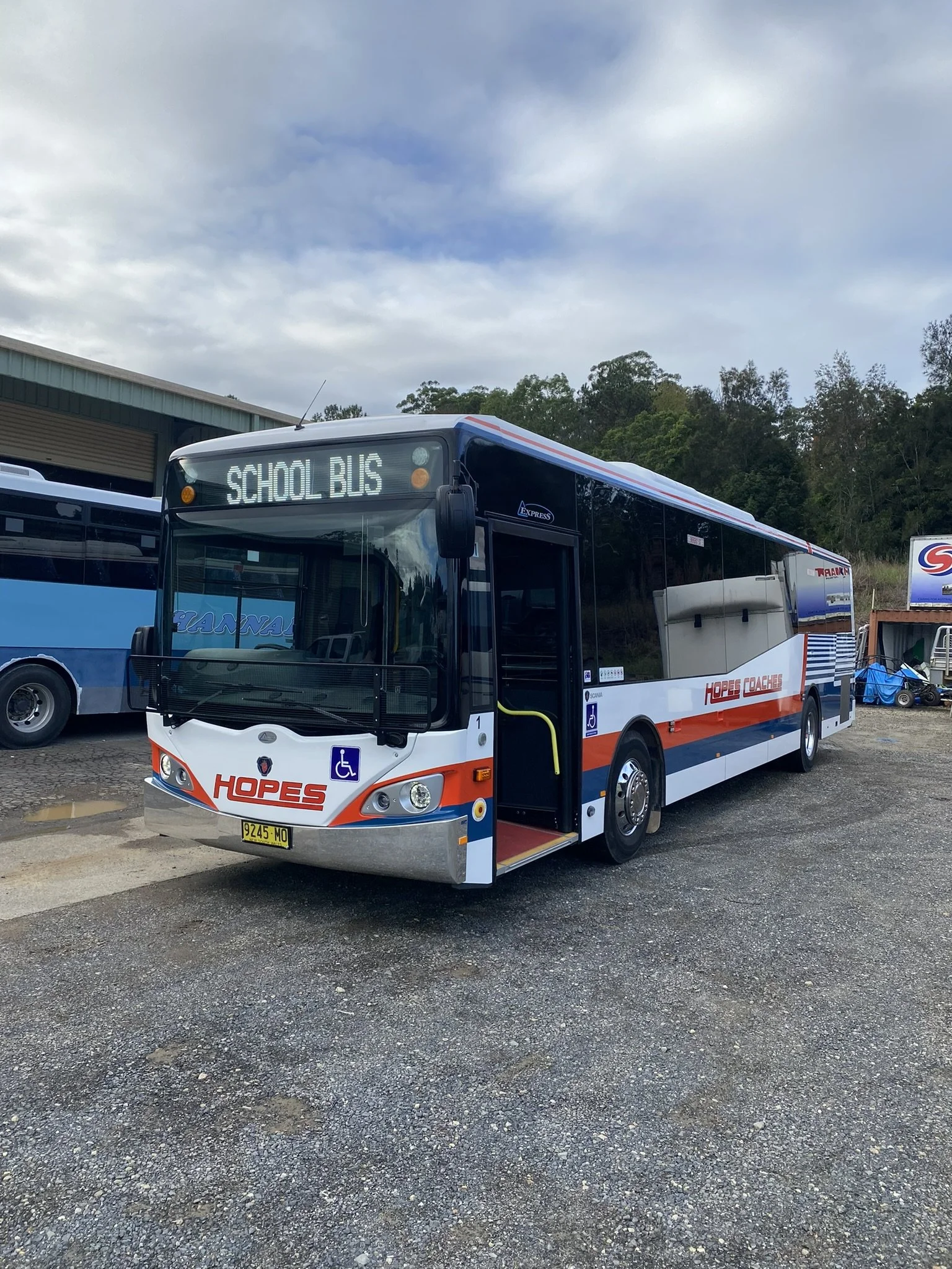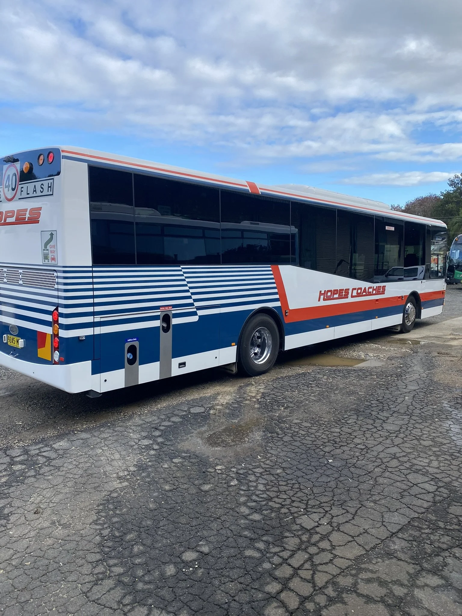 A Hope Coaches bus parked on a cracked asphalt lot under a partly cloudy sky.