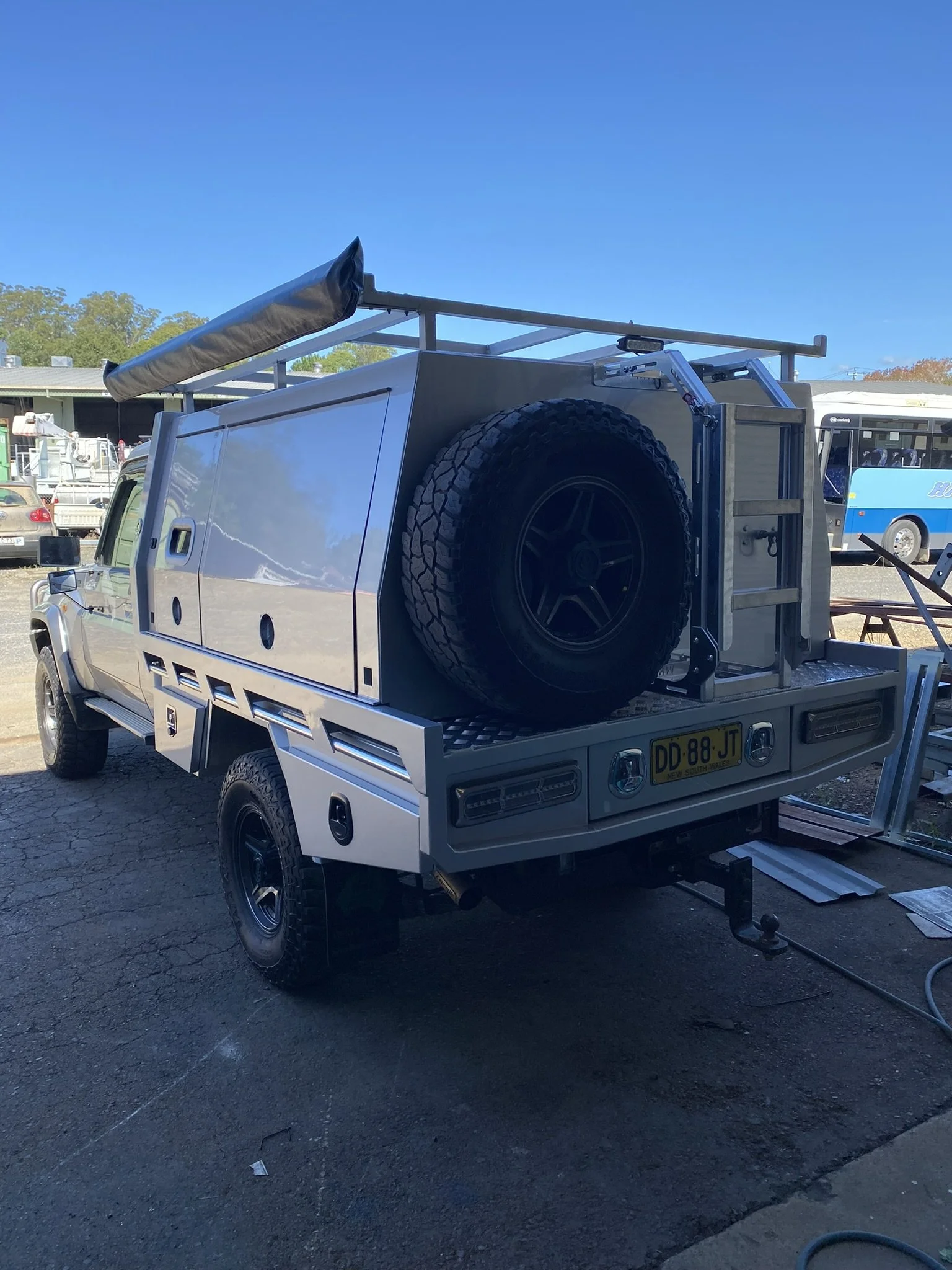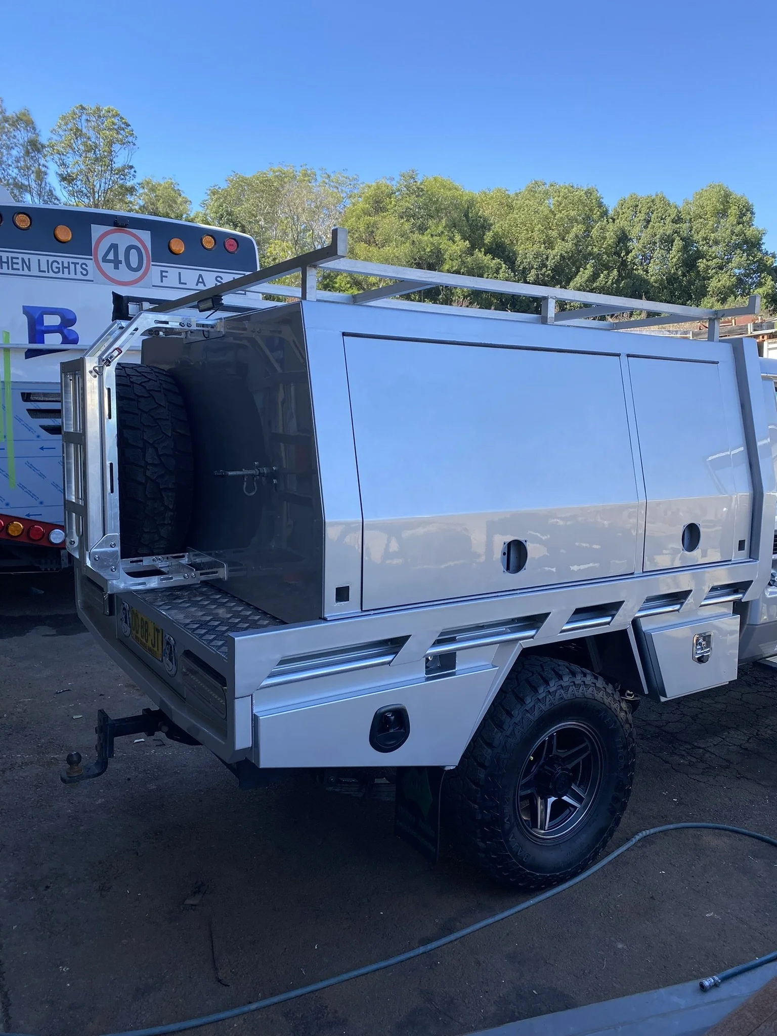 Silver utility truck with storage compartments and a spare tire, parked on dirt ground with trees and a blue sky in the background.