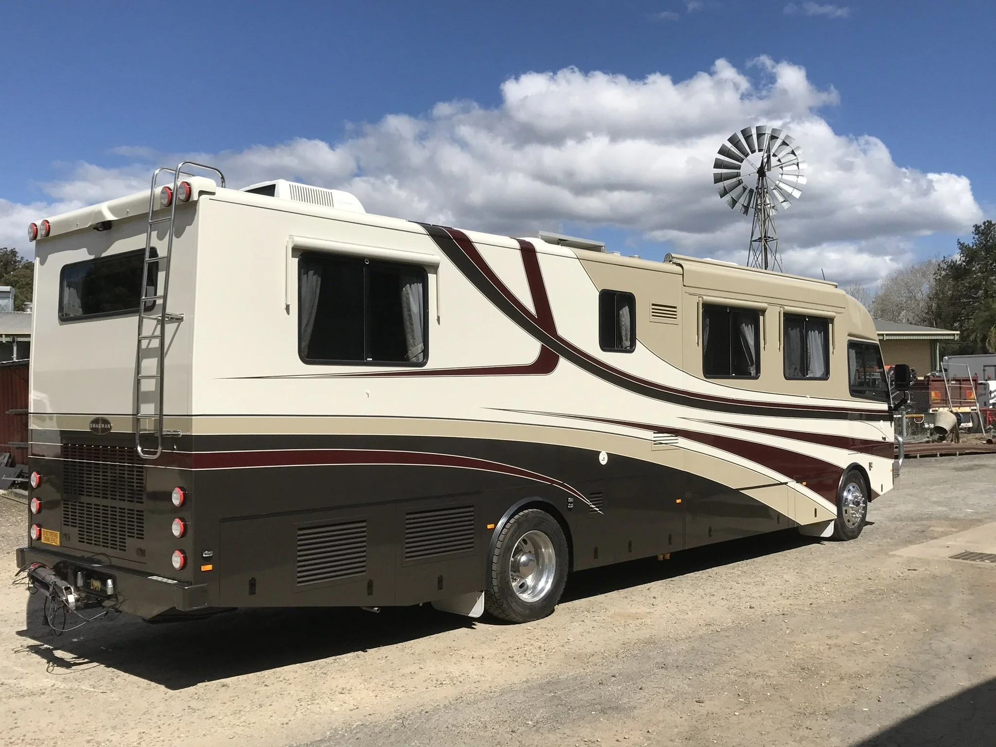 A beige and brown motorhome with multiple windows, a retractable ladder on the back, parked on a dirt lot beneath a partly cloudy sky.
