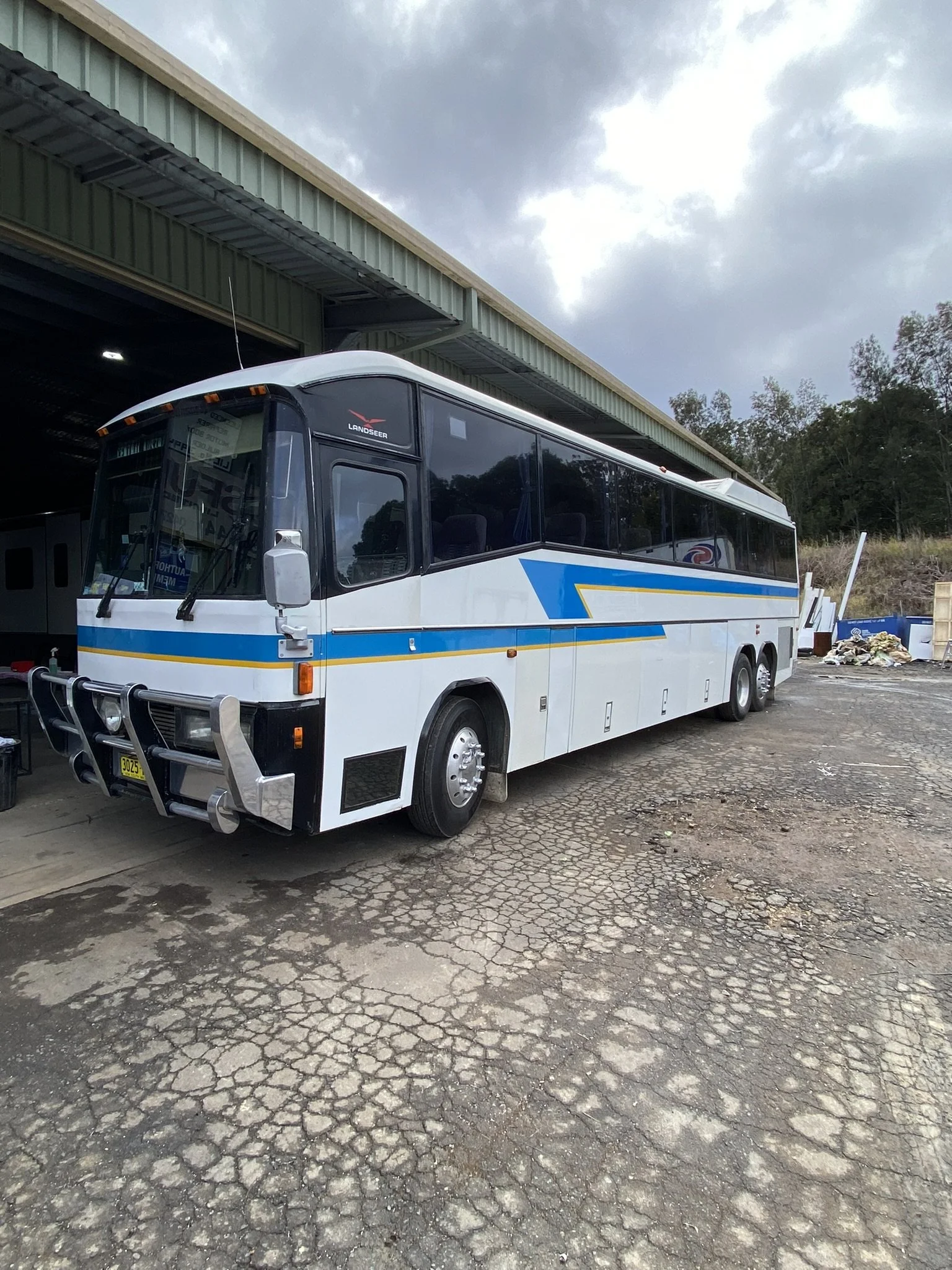A white and black bus with blue and yellow stripes parked outside a garage on cracked pavement.